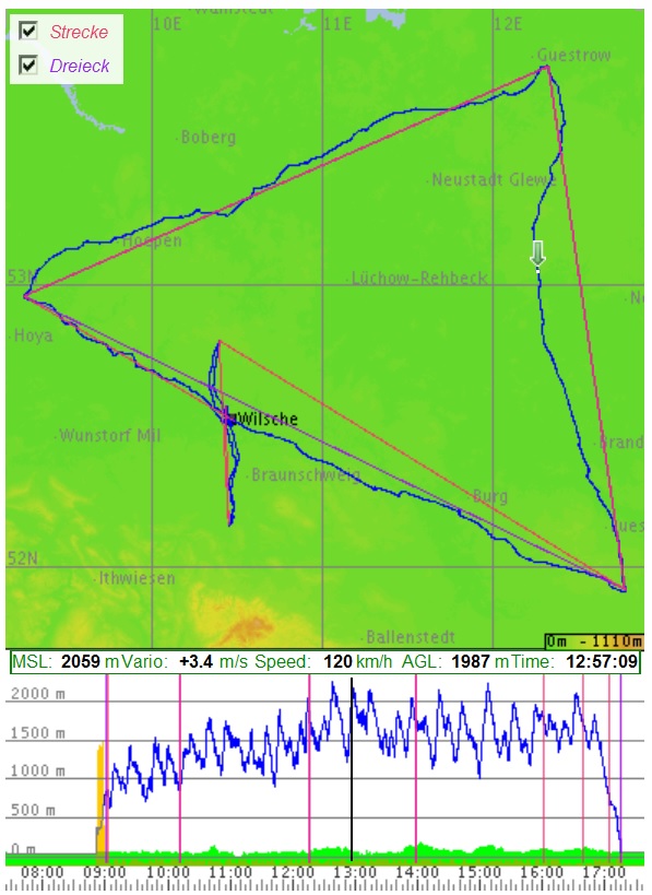 Alles wurde schnell an den Start gebracht, wo wir nun auf den Thermikbeginn und den Schlepper warteten. Die Wartezeit nutzten wir, um die Strecken untereinander abzusprechen und anzupassen. Als erste Wende Verden war für alle klar, um in den Quellwolkenbereich zu kommen, der für den Norden sehr ausgeprägt vorhergesagt war. Als die ersten Dunstkappen am Himmel auftauchten, wurden wir langsam nervös und stellten uns an die Winde, wo sich schon ein leichter Stau bildete. Aber auch Betti mit dem Eigenstarter hatte so ihre Probleme ;-) Dennis und Nico waren die ersten und berichteten bereits gute Steigwerte und Wolken im Norden, die vom Boden aus noch nicht zu sehen waren. Wir waren an dritter Stelle, nach uns kamen noch Mini und Matze Brack, die alle einen ähnlichen Flugweg geplant hatten. Wir stolperten im Blauen gleich über einen 2m/s-Bart. Ab Celle war eine klare Grenze von Blau-Thermik zu 2-3/8 Cu zu erkennen. Also ran an die Wolken, die bereits eine Untergrenze von ca. 1300 m erreicht hatten. In der Zwischenzeit sind auch die anderen gestartet. Im Funk hörten wir von den Vorwegfliegenden gute Steigwerte über 3m/s. Nachdem wir in Verden die Wende passiert hatten, haben wir eine Wolkenstraße in nördliche Richtung, die später aber einen Knick in Richtung Kurs machte, genommen und langsam kam Geschwindigkeit in die Geschichte. Nachdem wir in Höpen einen sehr guten Bart gezogen hatten, ließ uns die stetig ansteigende Basis den Duo Discus mit Geschwindigkeiten kurz vor dem Polarenknick vorfliegen. Auf dem Weg nach Güstrow, der zweiten Wende, wurde es nach der Elbquerung breitgelaufener, die Steigwerte waren jedoch weiterhin sehr gut. Nach dem Überfliegen des Schweriner Schlosses passte sich die Optik wieder dem vorhergesagten Wetter an. Kurz vor Güstrow kam ordentlich Druck unter den linken Flügel. Also schnell den Duo auf die Seite geworfen, da kam von hinten schon der Aufschrei „5m, 5,3m 5,5m/s“, was das zuvor verspürte Gefühl bestätigte. Das war der Bart des Tages, der uns zum ersten Mal in diesem Flug in Windeseile an die 2000 m Marke gebracht hat. Nach der Umrundung des Wendepunktes, richtete sich unser Kurs nach Süden in Richtung Zahna, welches einer der ältesten Orte in Sachsen-Anhalt ist. Im Raum Brandenburg musste ein blauer Streifen überbrückt werden, aber am Horizont Richtung Wende waren wieder gute Entwicklungen zu sehen. Aufgrund des Rückenwindes brachte uns dieser Schenkel eine super Geschwindigkeit, sodass der 2,5 Stunden Bundesliga-Schnitt auf 119,8 km/h gepusht wurde. Nachdem wir die Wolken erreicht und unseren letzten Pflichtwendepunkt umrundet hatten, ging es ab nach Hause. Kurz vor der erneuten Überquerung der Elbe, nahmen wir noch einen „Angstbart“ mit 2,5 m/s, was an diesem Tag ein eher schwacher Aufwind war, aber aufgrund der erneut geringen Entwicklungen auf Kurs sinnvoll erschien. Von hier aus konnten wir durchgleiten bis zu den Tagebauten kurz hinter Haldensleben, wo immer mit einem guten Aufwind zu rechnen ist. Die Information über diesen Bart gab ich über Funk an die anderen weiter, welche Nico, 500 m tiefer, nutzte. Auf dem weiteren Gleitweg nach Hause, waren ab Wolfsburg plötzlich wieder gute Quellwolkenentwicklungen. Nach dem Überqueren des Heimatflugplatzes um 17:30 Uhr nach 6,5 Stunden, wollten wir aber noch nicht landen. Also nochmal schnell einer Aufreihung nach Unterlüß folgen und anschließend in die Gegend von Wolfenbüttel. Dieser Schlenker wurde aufgrund der hohen Anzahl von Wendepunkten nicht voll gewertet, aber am Ende waren es 697 km angemeldet und auf 837 km verlängert. Dann zerfielen allmählich die Wolken. Jetzt reichte es uns aber auch, da ich schon seit zwei Stunden, aufgrund der eingefrorenen Füße, die Seitenruderpedale nicht mehr spürte. An diesem Tag konnten alle ihre gestecktes Ziel erreicht oder sogar übertreffen und es sind alle wieder in Wilsche gelandet.