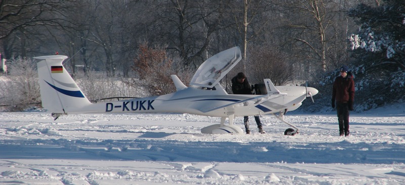 Hier zeigt sich dann der Masseunterschied der beiden Flugzeuge. Die Dimona ist locker 200kg schwerer, entsprechend dauert es länger, bis sie die Abhebefahrt hat und sie sinkt tiefer in den Schnee. Einen ersten Startversuch bricht David dann ab. Auch der zweite misslingt leider, die Abhebegeschwindigkeit wird nicht erreicht. "Schade, nix zu machen, dann wird das heute nix" kommentiert David die Sache trocken. "Noch einen Versuch unternehme ich nicht, kommt ein anderer Tag." Auch wenn es manchmal wehtut, so zeichnet es einen guten Flieger aus, auch einmal das Flugzeug wieder in die Halle zu stellen, wenn es nicht sein soll.
