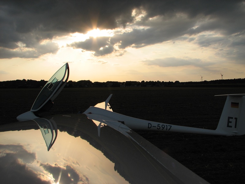Natürlich endet nicht jeder Streckenflug mit der Landung am Startplatz. Manchmal, wenn die Thermik den Piloten verläßt oder dieser die Streckenplanung etwas zu optimistisch durchgeführt hat, ist eben kein Flugplatz mehr erreichbar. In dem Fall ist es dann ein glatter, ebener Acker, möglichst ohne Bewuchs, der als Landemöglichkeit herhalten muß. Auf diese Weise ist auch das folgende Foto entstanden.